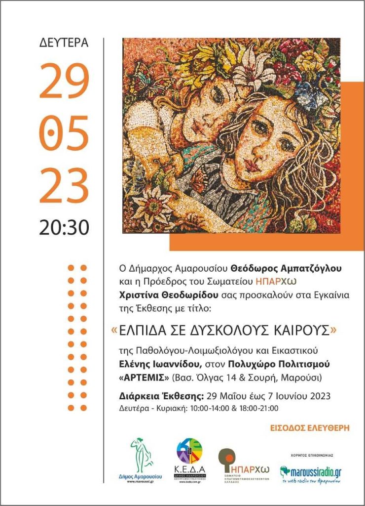 Ο Δήμαρχος Αμαρουσίου Θεόδωρος Αμπατζόγλου και η Πρόεδρος του Σωματείου «ΗΠΑΡχω» Χριστίνα Θεοδωρίδου σας προσκαλούν στα Εγκαίνια της Έκθεσης με τίτλο «Ελπίδα σε δύσκολους καιρούς» της Παθολόγου-Λοιμωξιολόγου και Εικαστικού Ελένης Ιωαννίδου, τη Δευτέρα 29 Μαΐου 2023, στις 20:30 στον Πολυχώρο Πολιτισμού «ΑΡΤΕΜΙΣ», Βασιλισσης Όλγας 14 και Σουρή, Μαρούσι.