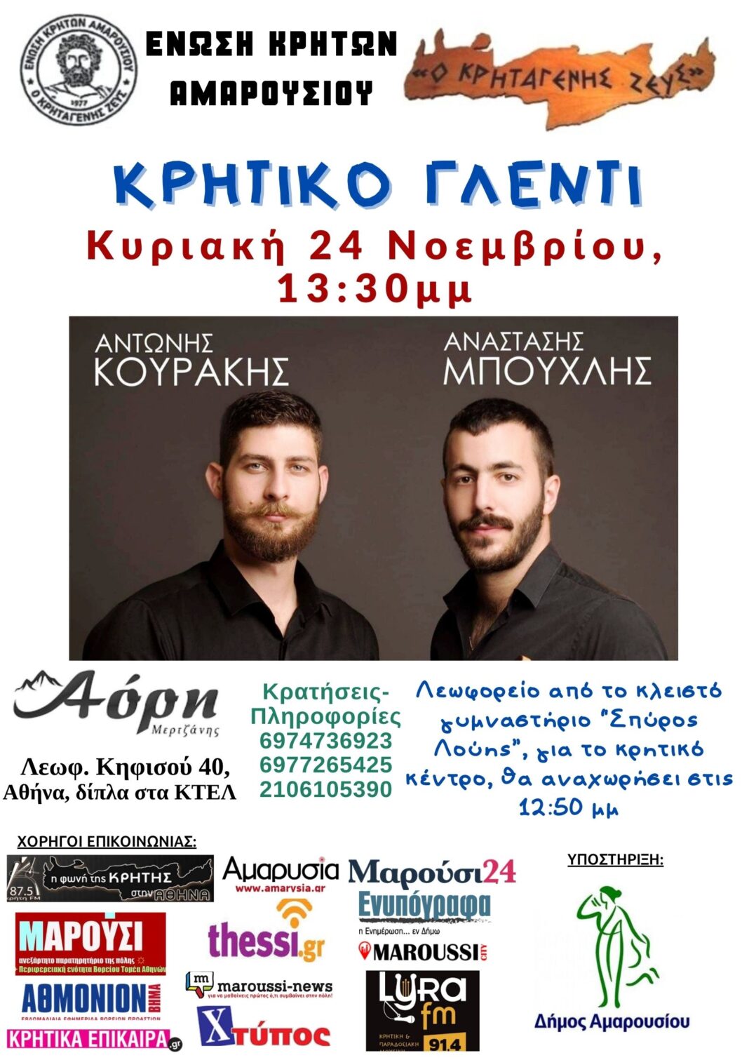 Η Ένωση Κρητών Αμαρουσίου «Ο Κρηταγενής Ζευς» καλεί τα μέλη και τους φίλους της στο κρητικό γλέντι του συλλόγου, που διοργανώνει την Κυριακή 24 Νοεμβρίου 2024 και ώρα 13:30 το μεσημέρι, στο κρητικό κέντρο «ΑΟΡΗ», Λεωφ. Κηφισού 40 (δίπλα στα ΚΤΕΛ), Αθήνα.