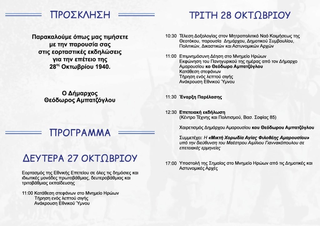 Ο Δήμος Αμαρουσίου γιορτάζει την Εθνική Επέτειο της 28ης Οκτωβρίου με κάθε επισημότητα και λαμπρότητα, όπως αρμόζει στους Ήρωες του Έπους του 1940 και απευθύνει πρόσκληση στους πολίτες να συνεορτάσουν και να τιμήσουν μαζί την Εθνική Επέτειο.