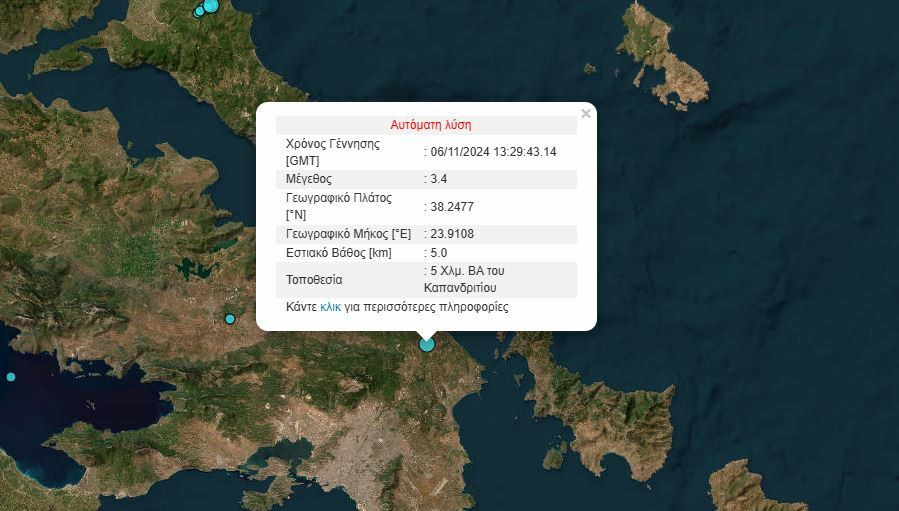 Σεισμός σημειωθηκε στο Καπανδρίτι το μεσημέρι της Τετάρτης 6/11/24, με επίκεντρο πέντε χιλιόμετρα βορειανατολικά του Καπανδριτίου.
