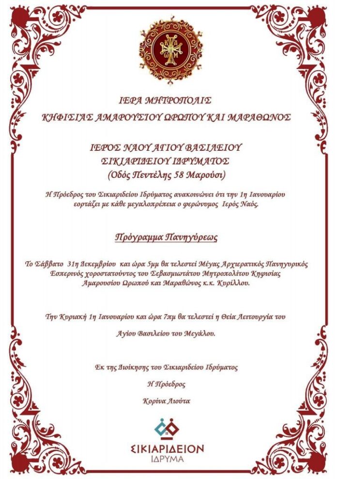 Το πρόγραμμα εορτασμού του Ιερού Ναού Αγίου Βασιλείου Σικιαριδείου Ιδρύματος
