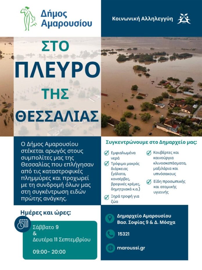 Ο Δήμος Αμαρουσίου στέκεται αρωγός στους συμπολίτες μας της Θεσσαλίας που επλήγησαν από τις καταστροφικές πλημμύρες και προχωρεί με...